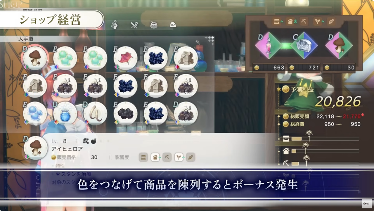 ・【ショップ経営】素材や調合で作ったアイテムを販売して、リアスの祖父が残したお店「ヤドリギ堂」を再興しよう!