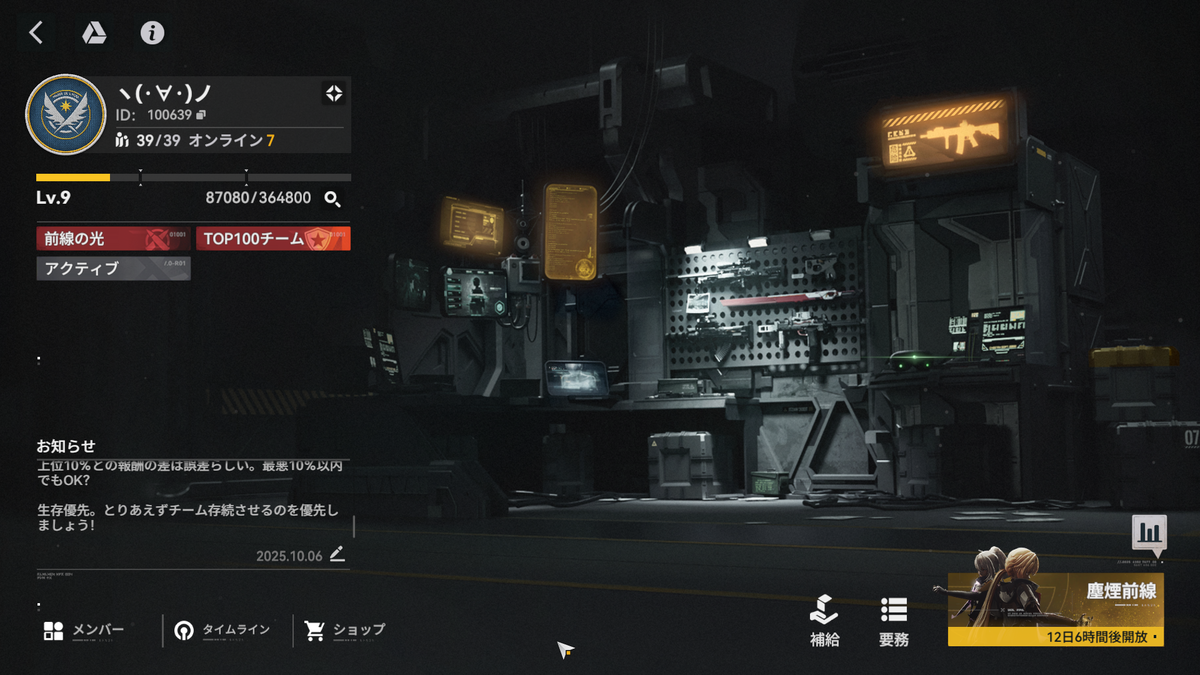 ちなみにチームメンバーの引退の原因No.1がこの塵煙前線でした。「1週間ずっとやり続けるのしんどいので引退します」って声が多かった。塵煙前線が始まるタイミングで皆インしなくなって辞めるんですよね…。