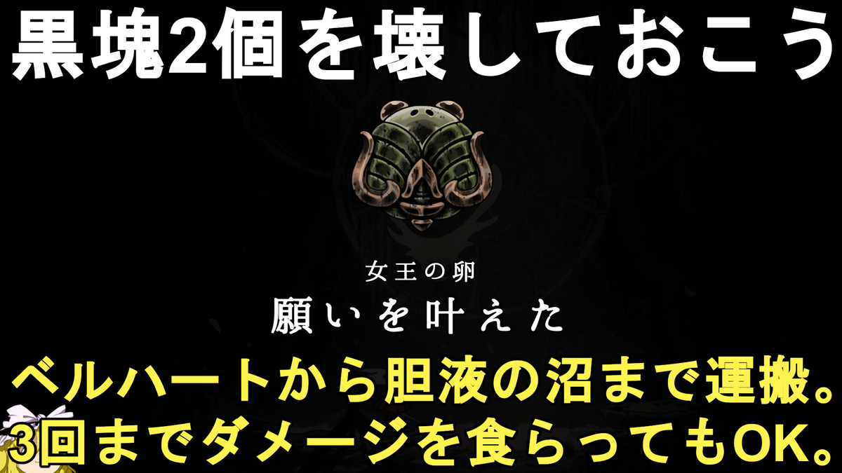 黒塊2個を壊したら運搬を開始します。ベルハートから胆液の沼の右下まで行かないといけないです。4回攻撃をもらったらアウト。ただ、時間制限はないので、薄切り肉の運搬みたいに急ぐ必要はないです。